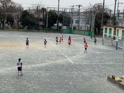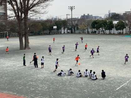 校庭ではフルピッチで1年生がサッカーに取り組んでいます。インサイドパスを学び、スモールゲームを経験して、今日はいよいよフルピッチでのゲームです。ゴールを決めた味方にチームのメンバーが駆け寄る微笑ましい姿や、負けて校庭をけり上げる悔しさを見せる場面もありましたが正々堂々と戦っていました。