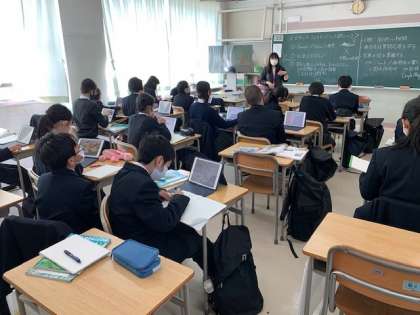 1年生英語では「世界のテーブルマナー」について、ipadを活用して情報収集しネットを通じてグループ内で情報を共有し、グループごとに発表を行いました。タブレットの操作の上手な生徒がアイデアをクラス中に拡散し、あっという間にそのアイデアが浸透してさらなる進化を遂げていました。終始楽しそうな主体的な授業で、中学生の吸収力とそれを進化させる力のすごさを感じた授業でした。