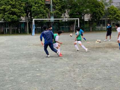 4月17日、時折の雨がありますが、校庭では緑丘中と桜木中の2校で合同練習が行われています。明日の練習試合に向けてデフェンスの連携確認とボールの奪い方をチーム全員でトレーニングしています。