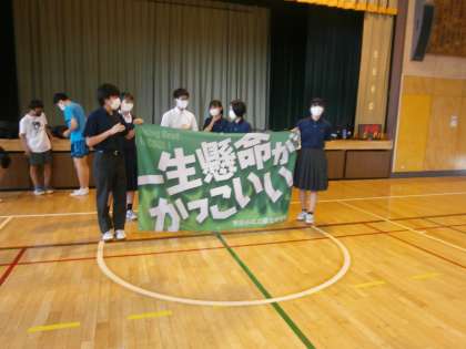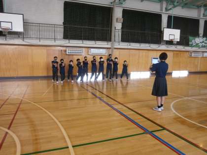 ホストタウン応援リレー動画の撮影の募集をかけたところ、部活動10団体からのエントリーがあり、抽選を行いました。結果、男子バレーボール部、男女バスケットボール部、美術部、緑のボランティア部、女子バレーボール部、ソフトテニス部が当選しました。リハーサルでは各チームが声をしっかりと出して練習に取り組んでいました。練習ではタブレットも活用して、撮影した動画を観てチームで改善策を練りました。