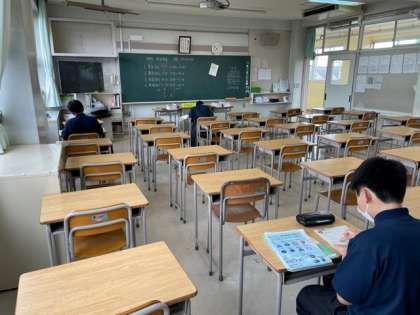 期末考査2日目の朝の教室では、8時前から黙々と試験勉強に励む生徒の姿が見られます。折り返し地点の2日目ですが試験に向かう気持ちは十分に感じられます。緊張せずに積み重ねた力を発揮しましょう。