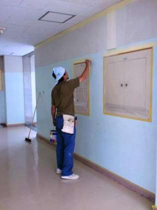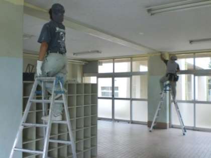 夏休みは普段できない校舎の補修工事ができる唯一のチャンスでもあります。この夏は、廊下の壁塗りを主事さんにやっていただきました。といってもこの広さの校舎を本校のお二人だけでは、とても夏の間には終わりません。そこで区の教育委員会に「助っ人」をお願いしたところ、8名の方がお手伝いにきてくださいました。全部で10名の主事さんで、あっと言う間に北校舎の1階から3階までの廊下と昇降口が‘新品’に生まれ変わりました。暑い中、黙々と作業に励んでくださり本当にありがとうございます。