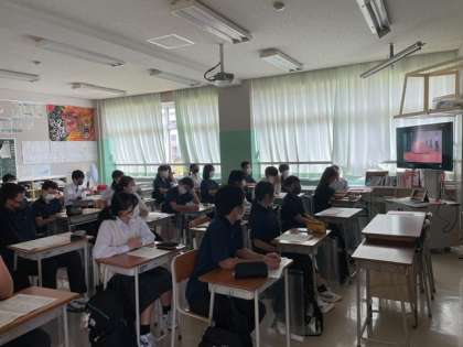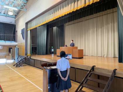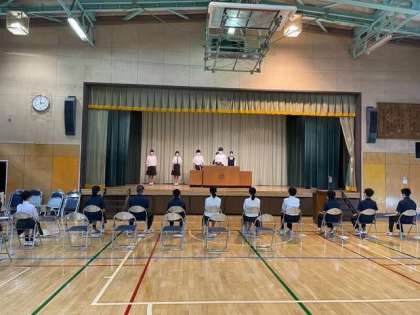 10月8日6校時、体育館で後期委員会認証式と生徒会役員引継ぎ式を開催しました。コロナ感染症予防のため、生徒会役員と各委員のみ体育館に集まり、式の様子は各教室にzoomで配信しました。