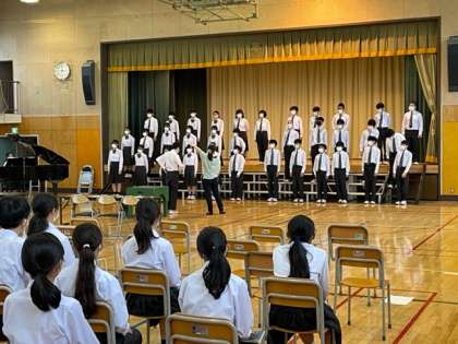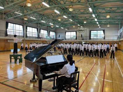 1年生体育館リハーサル 公開日 2021/10/12 更新日 2021/10/12 今日のできごと 1年生には体育大会の次に経験しなければならない緑丘中の大きな行事。それが合唱コンクールです。昨年はコロナ感染症のため中止となりましたが、今年度は緑中体育館で開催です。 課題曲全体合唱、「大切なもの」。 教室にいる先輩たちに届けと言わんばかりに懸命に歌う1年生の姿に当日の期待感が高まりました。 いいね(0)