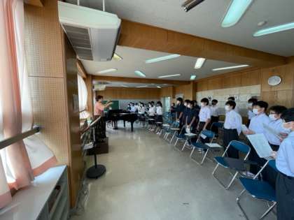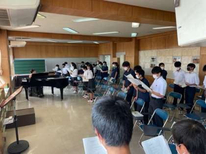 合唱コンクール「有志合唱」 公開日 2021/10/16 更新日 2021/10/16 今日のできごと 昼休みに音楽室に有志が集まり、合唱コンクールで発表する、「群青」を練習しています。 Wikipediaで検索すると「群青の誕生まで」のページで曲の背景がわかります。学年を超えた有志がひとつにまとまり歌い上げる当日が楽しみです。 いいね(0)