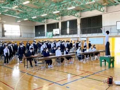 オープニングは1年生。一生懸命歌っています。体育館に声が響いています!