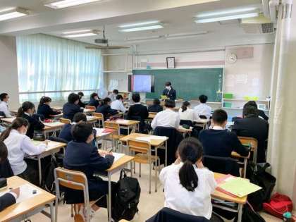 「身近な職業インタビュー」の発表が始まりました。生徒たちは夏休み中に家族をはじめ、身近な人に職業に関するインタビューを行いました。先生方にインタビューをする生徒も見られました。その職業の内容、大変なこと、やりがい、中学生へのメッセージなどを中心に、生徒は自分の考えも交えながら堂々と発表を行いました。発表を聴く生徒も、様々な職業に興味津々で、積極的に質問をしていました。