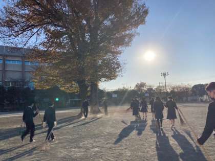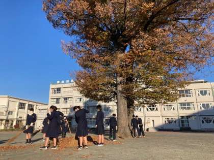欅からの秋の贈り物(葉)を必死にかき集める3年生です。
