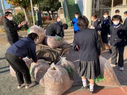 本日の落ち葉清掃ボランティアに、3学年総勢150人余りの生徒が参加しました。寒空の下、生徒は自ら進んで声をかけ合い、分担して清掃に取り組みました。欅が落とした沢山の葉も、生徒の手にかかればものの数分で片付けられてしまいました。次回のボランティアは12月2日に行われます。