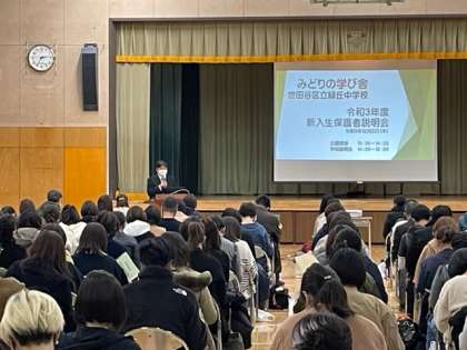 12月2日、令和4年度新入生保護者の皆様へ説明会を開催しました。前半は授業公開で緑丘中の教育活動を見ていただき、後半は体育館にて各主任より学校生活についての説明がありました。