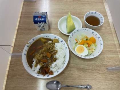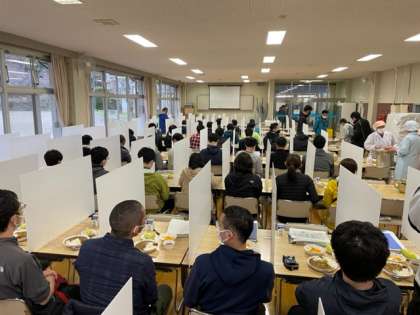 学園での夕食はコロナ感染症予防のためパーティションを設置し、対面にならないよう配慮されていました。また、メニューはカレーライスとサラダでした。
