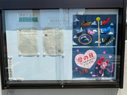 西門脇の掲示板に美術部が、「母の日」「こどもの日」の作品を飾りつけしてくれました。近くをお通りの際、ぜひご覧になってください。