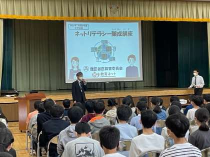 中学生がソーシャルメディアを利用する際に、インターネットに関するトラブルに巻き込まれないためのリテラシーを育て、そのうえで、ただインターネットの利用を制限するのではなく、どう人生において有効的にインターネットを使っていくべきか、実例を踏まえ、「インターネットの可能性」を学びました。