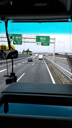 時間通りに出発して、高速道路で府中を通過中です。