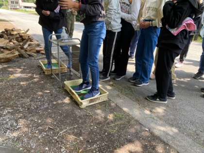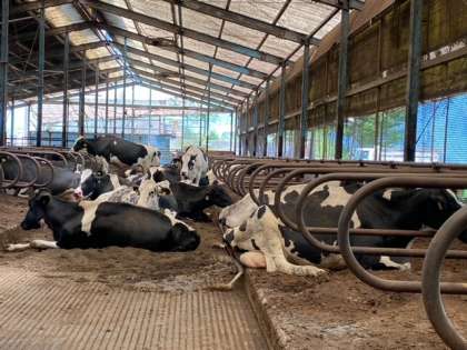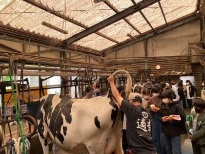 乳搾り班と餌やり班に分かれて酪農体験中!