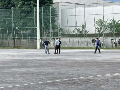 緑丘中背番号1番左腕投手が打者3人を内野ゴロで0点に抑えたところで天気が急変。グランドが雨雲に覆われ遠くから雷鳴もかすかに聞こえてきました。審判が協議し、一時中断となりました。