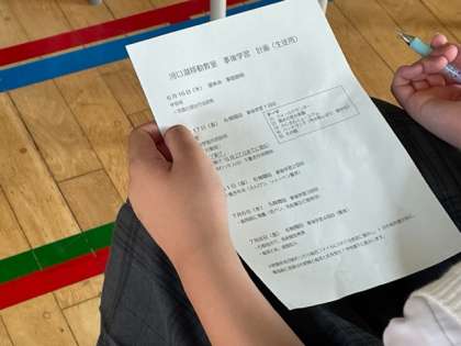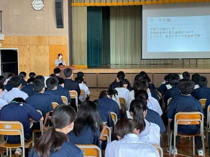 1年生は河口湖事後学習の第1回目を体育館で行いました。事後学習として新聞作りを行うので、まとめ方や注意することなどの説明を聞きました。完成後、学習発表展示の部で掲示予定です。