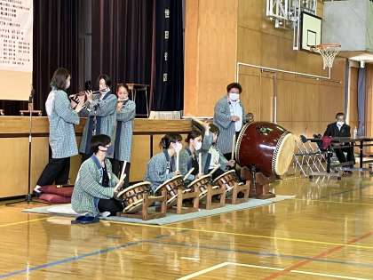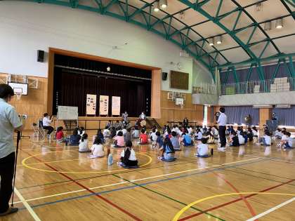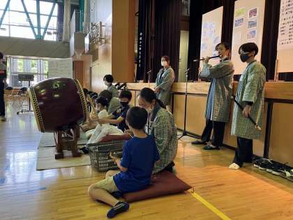 7月9日(土)、八幡山小学校にて開催された八幡山囃子の演奏・体験授業(小学3年生向け)に緑丘中3年生の2名が伺いました。