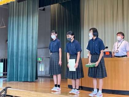 式後は夏休みに活躍した、吹奏楽部、女子バスケットボール部、バトミントン部の表彰も行いました。また、水泳部の関東大会出場に、PTAより横断幕を寄贈していただき、正門前に掲示中です。