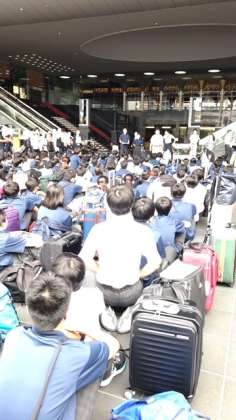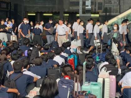 解散式が始まりました。京都駅前ということもあり、他校生や観光客などで混雑していますが、緑中生はしっかりと整列し校長先生のお話を懸命に聞いています。