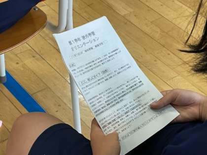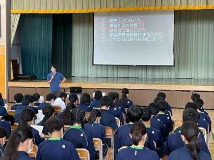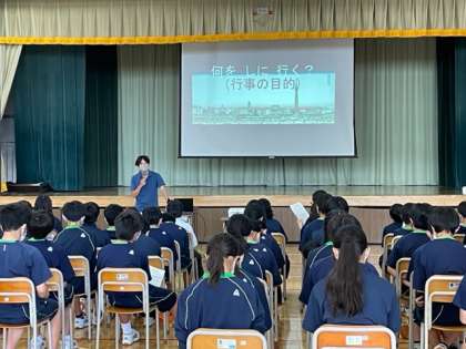 11月に校外学習を予定している1年生は体育館で第1回目の事前学習を行いました。10月末に合唱コンクールがあるため、少し早めのこの時期から学習を始めました。