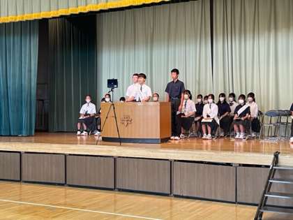 生徒会役員選挙立会演説会 公開日 2022/09/28 更新日 2022/09/28 今日のできごと 9月28日(水)の5時間目に「立会演説会」をzoomで行いました。立候補者の力強い演説に教室からzoom参加している生徒たちも真剣に取り組むことができました。 選挙結果は9月29日(木)の朝に「みどりの掲示板」に発表します。 いいね(0)