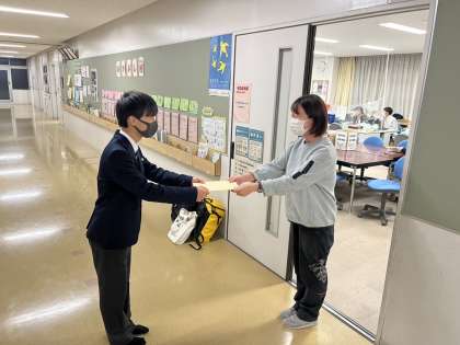 「令和4年度緑丘中学校紹介動画」が完成しました。本動画では、緑丘中学校の1日の様子が紹介されています。そして、先日、緑の学び舎である経堂小学校、上北沢小学校、八幡山小学校にDVDを届けに行ってきました。写真は、上北沢小学校の先生にDVDをお渡ししているところです。小学生の皆さんに喜んでもらえたら嬉しいです。