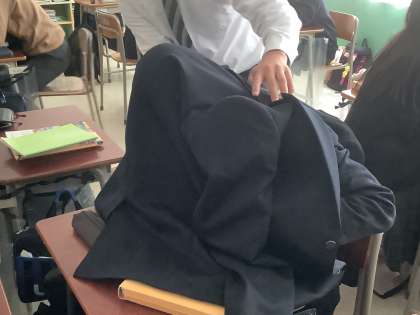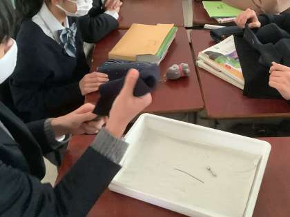 ネオン管はこの明るさでも光ったことが分かるのですが、蛍光灯はなかなか難しいです。後日、別の実験で理科室を使うときに暗い中で実験できるのですが、他のクラスでできた班もあると聞くと、挑戦したくなるようで、ブレザーで暗室をつくってみるなど(下写真)、いろいろと工夫をしていました。