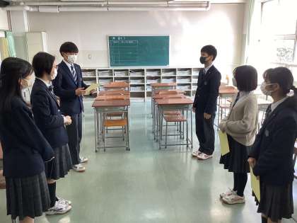 3月8日(水)昼休みに、第69代生徒会の3人に向けて三送会を行いました。後輩からはメッセージを寄せ書きした色紙が送られ、これまでの感謝を伝えました。