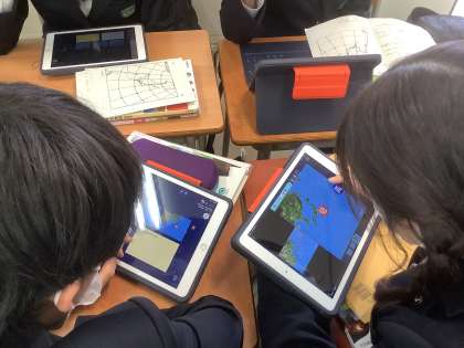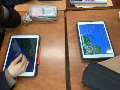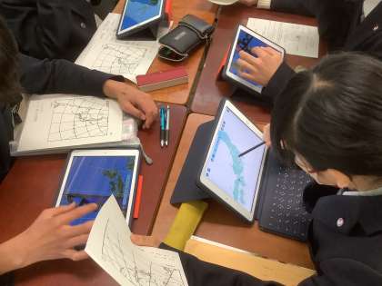 これまで、授業の中では、高気圧や低気圧の性質、周囲の風の吹き方、等圧線の意味や読み方、前線の性質などについて学んできました。そこで、過去の天気図2日分を基に、翌日の天気を予想するという課題に挑戦。天気図と天気予報、予報原稿を考えてもらいます。また、今回はiPadのアプリで共同編集を可能としているため、班で議論しながら同じ図に同時に記入するという作業をしてもらいました。
