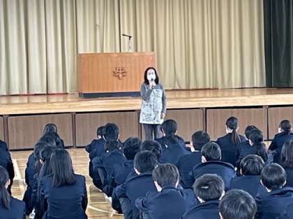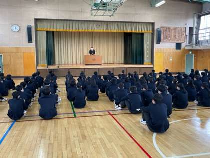 本日4校時、3年生は中学校最後となる学年集会を行いました。校長先生を含め3年の先生方からお別れのコメントをいただき、涙する場面もありました。中学校生活は残すところあと一日。思い出に残る最高の卒業式にしましょう!