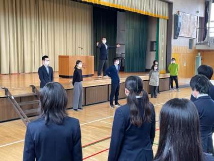 司会が3年生学年集会の終わりを伝えると同時に、「ちょっとまってください!」と声が聞こえて、なんとサプライズ!