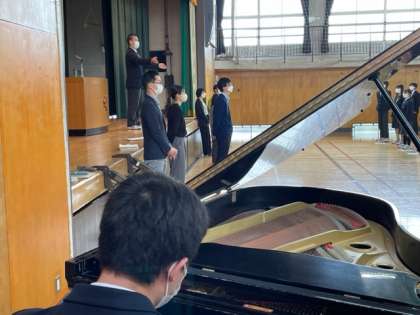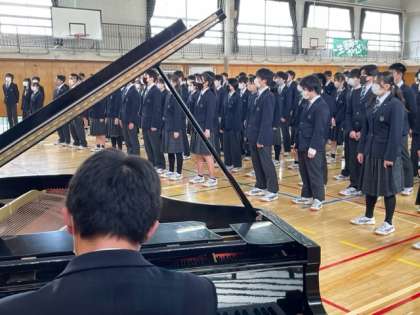 生徒たちから「旅立ちの日に」の大合唱。前に並んだ先生方からも大粒の涙が・・・