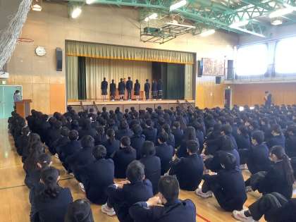 体育館で認証式が行われました。これは、生徒会の一員として委員会の仕事を校長先生から委嘱されるものです。これまでは体育館に集まることがはばかられていたため各教室でリモートで行いましたが、今年度は全校揃って実施することができました。委員長は壇上に上がったので、全校生徒の前で、より信任と責任を実感することができたと思います。短時間でしたが、厳かな雰囲気で行われました。