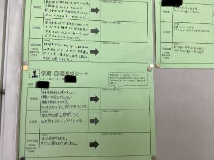 「目標達成シート」には、目標に対する振り返りを学期末に記入します。それを受けて、2学期に新しい目標を設定します。PDCAを意識しながら、自分を成長させていけるといいです。