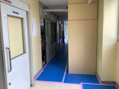 工事の影響で廊下が狭くなっています。安全・安心な学校生活を送りましょう。