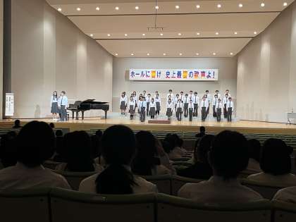 初めてのホールで、そして大勢の観客を前にして歌ったのでとても緊張したと思います。それでも、各クラスで練習の成果を発揮し、大きな声で歌い切りました。生徒一人一人が努力した結果をホールで見せることができました。