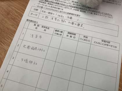 各班で分野・テーマを決め、行きたい場所について調べ学習を行いました。調べた内容をもとに、校外学習のコースを決定していきます。