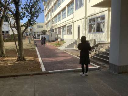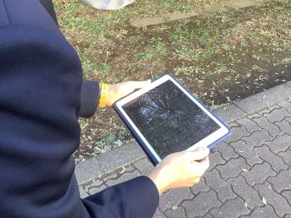 今回は、ARを使って、太陽系の広がりを実感してもらう実習を行いました。あらかじめ作成しておいたARモデルでは、太陽系を100億分の1の大きさに配置しています。中庭のちょうどよい場所で起動し、太陽から順に歩いていって、8個の惑星を探してもらうという活動です。ただ、大きさも100億分の1にすると、一番小さい水星では直径0.5mm、距離は一番遠い海王星は450mになるため、探すのも一苦労(敷地内では、火星までが限界です)。今回は、太陽系の大きさを実感することが目的だったので、実際に歩いて探し、その距離感に対する理解が深まったようです。