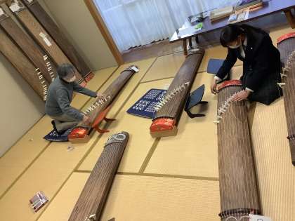 箏の先生に来ていただき、課題曲の練習をしました。1年生と2年生で別の曲を演奏するため、練習は学年ごと、時間を半分ずつ使って行います。