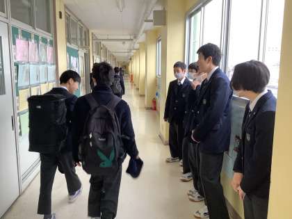 あいさつ週間を行っています! 公開日 2024/03/08 更新日 2024/03/08 今日のできごと 学級委員を中心に登校してきた生徒にあいさつをする、あいさつ週間を行っています!有志も募集していて、日に日に参加者が増えています。来週もあいさつ週間を行うので、生徒の皆さんはぜひご参加ください! いいね(0)