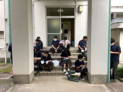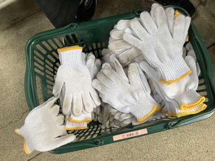 先日の草取りボランティアで使った軍手には、たくさんの草がついていました。それを一つ一つ、部員たちの手できれいにしました。