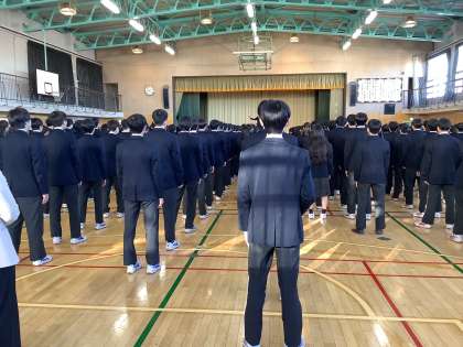 暖かな日差しと欅の木に見守られながら,新しい年,新しい学期を迎えることができました。始業式では,校長先生から十二子の「巳」のもつ意味についてお話がありました。今の自分よりさらに大きな自分になれるように,今年も1年頑張りましょう。