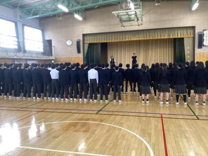 学年セレモニーに向けて、学年で合唱練習を行いました。 公開日 2025/02/05 更新日 2025/02/05 今日のできごと 2月6日(木)5校時の学年セレモニーで、留学生に合唱を披露するために、練習を行いました。1校時の時間帯で声が出ずらい部分もありましたが、生徒たちは一生懸命歌っていました。本番は心のこもった合唱を期待しています。 いいね(0)
