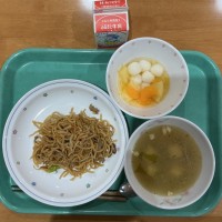 ⚫︎本日の献立⚫︎塩焼きそば 牛乳 豆腐とえのきだけのスープ フルーツ白玉⚫︎主...