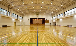 体育館は2階まで吹き抜けです。体育館棟の体育施設はこのほかに格技室、ミーティングルーム、更衣室などがあり、3階部分にはプールが設置されています。