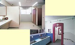 各階の入り口はすべて異なる配色。デザイン性のある明るい空間となりました。車いす対応型が1ヶ所、温水洗浄型便座はすべての階に設置しています。