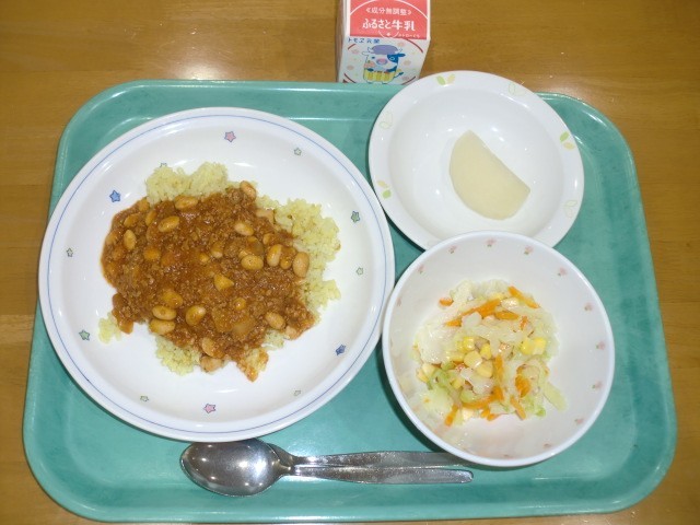 チリビーンズライス 牛乳 コーンサラダ くだもの