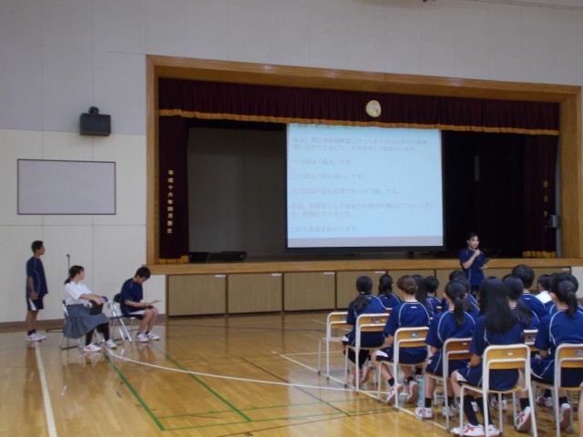 1年生では、各クラスの代表による河口湖移動教室のまとめの学年発表が行われました。