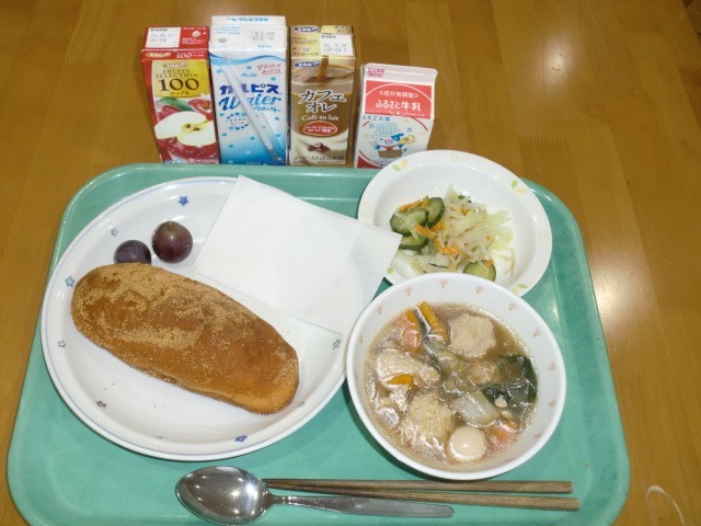 あげパン(きなこ) セレクト飲み物 肉団子入り春雨スープ 野菜のドレッシングかけ くだもの